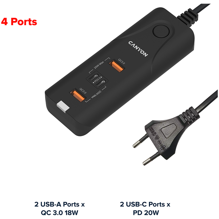 CANYON H-10, Wall charger. CNE-CHA10B Input: 100-240V~50/60Hz 1.0A Max Output1/Output2: DC USB-A QC3.0 5.0V/3.0A,9.0V/2.0A,12.0V/1.5A 18.0W(Max)USB-C PD 5.0V/3.0A,9.0V/2.22A,12.0V/1.67A 20.0W(Max)USB-
