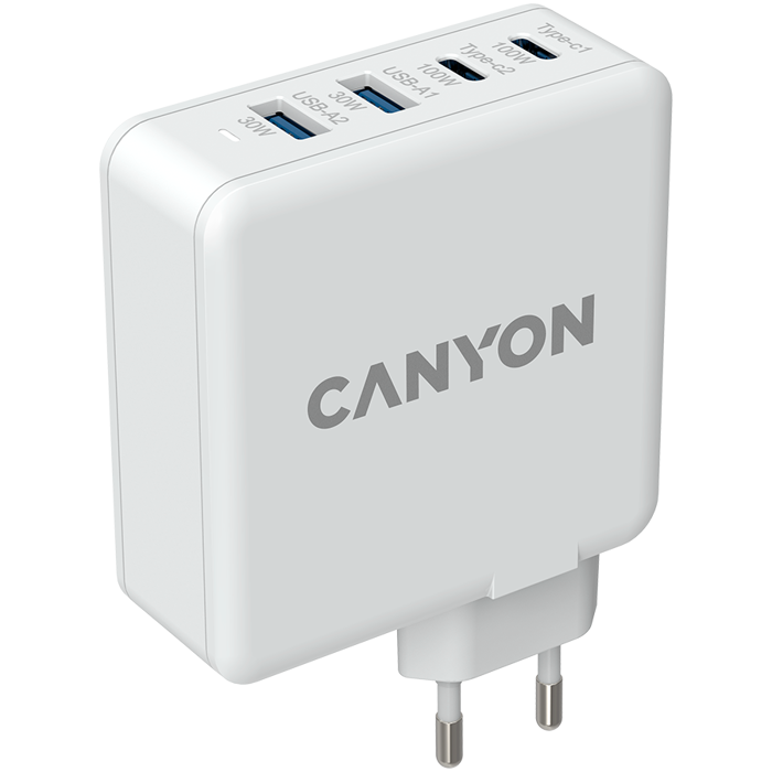 CANYON H-100, GAN 100W charger Input: 100V-240V Output: USB-C1/C2: 5V 3A , 9V 3A , 12V 3A , 15V 3A , 20V 5A USB-A 1/A2: 4.5V/5A, 5V/4.5A, 9V/3A, 12V/2.5A, 20V/1.5A C1+C2 : 65W + 30W; C1+A1 : 65W