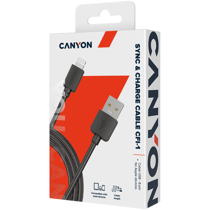 CANYON Lightning USB Cable for Apple, round, 1M, Black