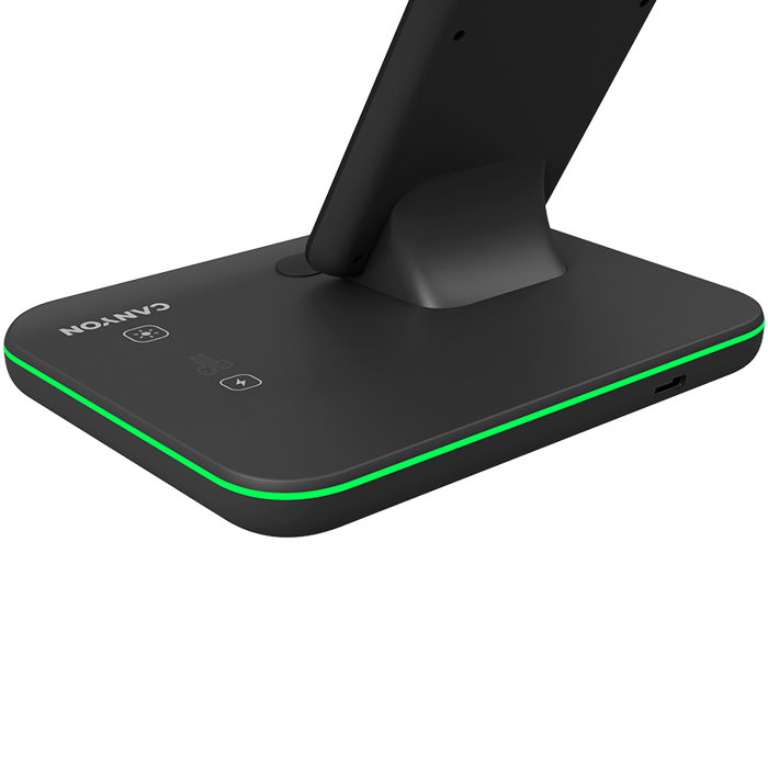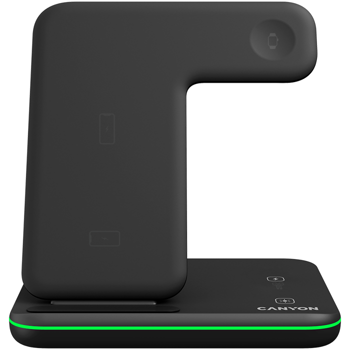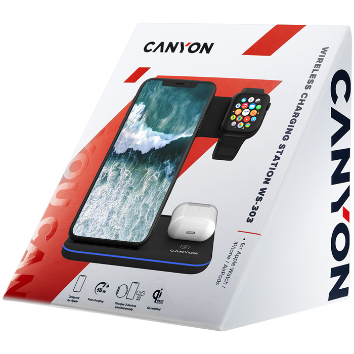 CANYON WS-303 3in1 Wireless charger, with touch button for Running water light, Input 9V/2A, 12V/2A, Output 15W/10W/7.5W/5W, Type c to USB-A cable length 1.2m, 137*103*140mm, 0.195Kg, Black