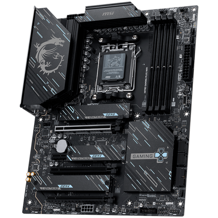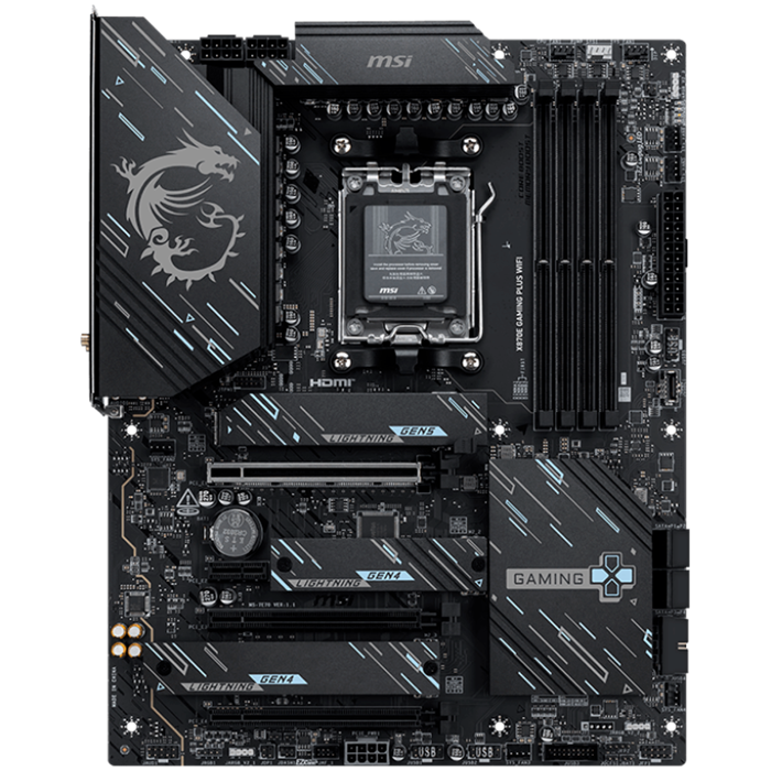 MSI X870E GAMING PLUS WIFI, ATX, Socket AM5, 4x DDR5 Dual Channel DDR5 up to 8200(OC)MHz, 3x PCIe x16 slot, 3x M.2 slot, 4x USB 2.0, 2x USB 5Gbps, 2x USB 10Gbps, 1x 20Gbps Type-C, 1x 40Gbps Type-C, HD