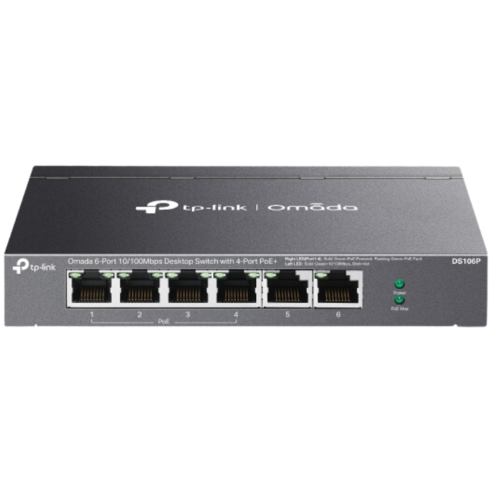 Omada 6-Port 10/100 Mbps Desktop Switch with 4-Port PoE+ PORT: 4× 10/100 Mbps PoE+ Ports, 2× 10/100 Mbps Non-PoE Ports 802.3at/af, 67 W PoE Power, Desktop Steel Case Extend Mode for 250m PoE Transmitt