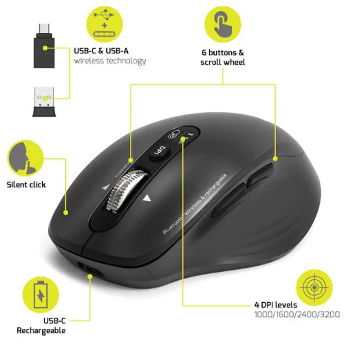 Device Location: External Connectivity Technology: Wireless Wireless Technology: Bluetooth/RF Frequency: 2.4 GHz Interface: USB Number of Buttons: 4 Movement Resolution: 4000 dpi Max&Min Movement Resolution: 400dpi1000dpi1600dpi Mouse Features: Scro