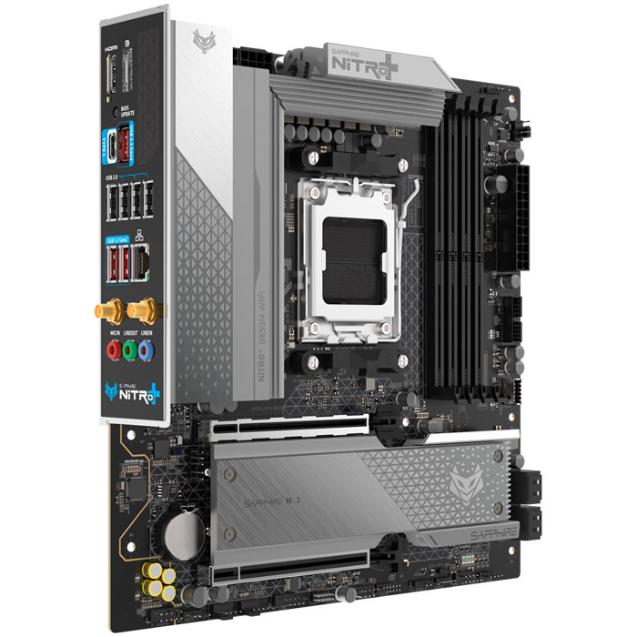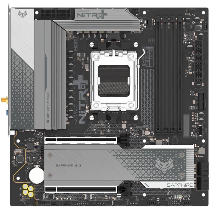 SAPPHIRE AMD B850M AM5 NITRO+ Ryzen R9/R7/R5, 4x DDR5 8000MHz, PCIE 5, 1x M.2 Gen5, 1x M.2 Gen4, LAN 2.5 Gbps, WIFI6, USB, MATX, 52123-01-40G